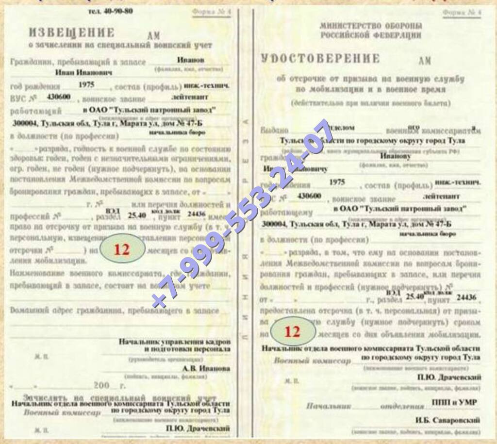 Наша компания предлагает купить в Омутнинске удостоверение об отсрочке на военную службу на максимально выгодных условиях для клиента. Документы легальные, использованы бланки государственного образца.